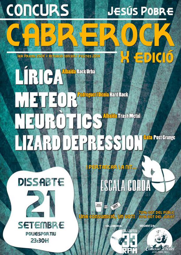 La desena edició del  Cabrerock de Jesús Pobre arriba aquest dissabte amb un concurs de bandes a esta localitat de la Marina Alta. El certamen es celebra un any més per tal de recolzar les bandes novells de les comarques centrals, una tasca molt important si tenim en compte l’autèntic viver musical que representen estes comarques.