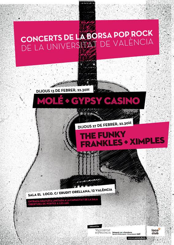 Els concerts de la Borsa Pop-Rock de la Universitat de València, encetats el passat 13 de febrer, continuen el proper dia 27 amb les actuacions de The Funky Frankles i Ximples a la Sala El Loco de la capital valenciana. Els concerts com de costum seran gratuïts per a estudiants, obriran portes a les 22h i començaran al voltant de les 22.30h. Esta iniciativa s’emmarca en un esforç de la Universitat per potenciar les bandes amb components en formació en aquesta institució.