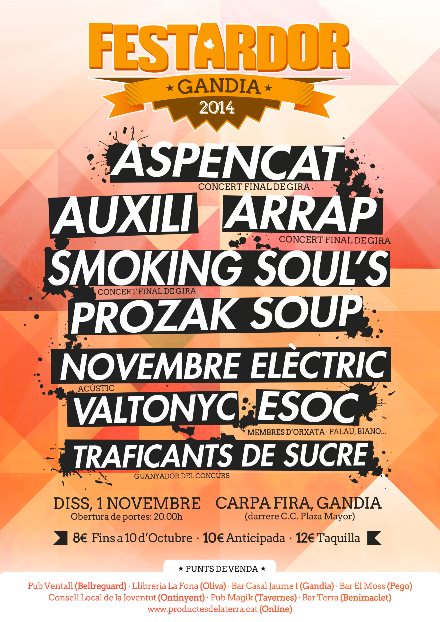 Un any més el Festardor arriba per fer les delícies del públic de La Safor, i les comarques centrals. En aquesta edició hi ha varies novetats, pel que fa a la data, que torna a novembre, i el lloc, que enguany serà en les carpes de Gandia. Les bandes que tanquen el cartell són Aspencat, Auxili, Arrap, Prozak Soup, Novembre Elèctric, Valtonyc, ESOC i Traficants de Sucre.