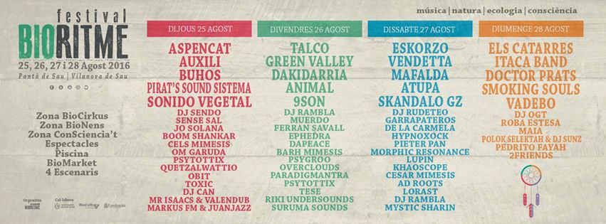 La quarta edició del festival Bioritme proposa una trobada al voltant de l’economia sostenible, l’alimentació ecològica, l’activisme social i la música. Enguany el Bioritme destaca per la massiva presència de grups valencians. Coincidiran al Festival de Vilanova de Sau Aspencat, Auxili, Mafalda, Atupa, Vadebo i Smoking Souls. Que compartiran escenari amb molts coneguts com Buhos, Green Valley, Talco, Dakidarria, Animal, Vendetta, Els Catarres, Itaca Band, Pirat’s Sound Sistema o Doctor Prats.