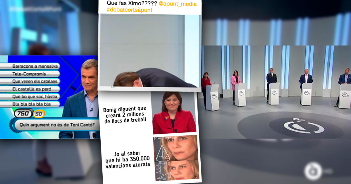 En fi, el que comentàvem, els mitjans valencians han definit el debat com conformistasense vencedors ni vençuts. També s’ha destacat així a les seccions valencianes de mitjans d’àmbit estatal, un debat amb respecte, sense veus solapades, sense acritud i, escolta, això s’agraeix, però els candidats a la presidència del govern espanyol van deixar molt de material per a memes, cosa que anit no vam veure al mateix nivell. Sí que és veritat que la gent va estar molt activa a Twitter, fins i tot el hashtag #DebatCortsÀPunt va arribar a ser 5é Trending Topic a Espanya i va estar unes quantes hores entre els 10 primers. A continuació rescatem alguns tuits que ens van fer el debat més interessant i divertit.