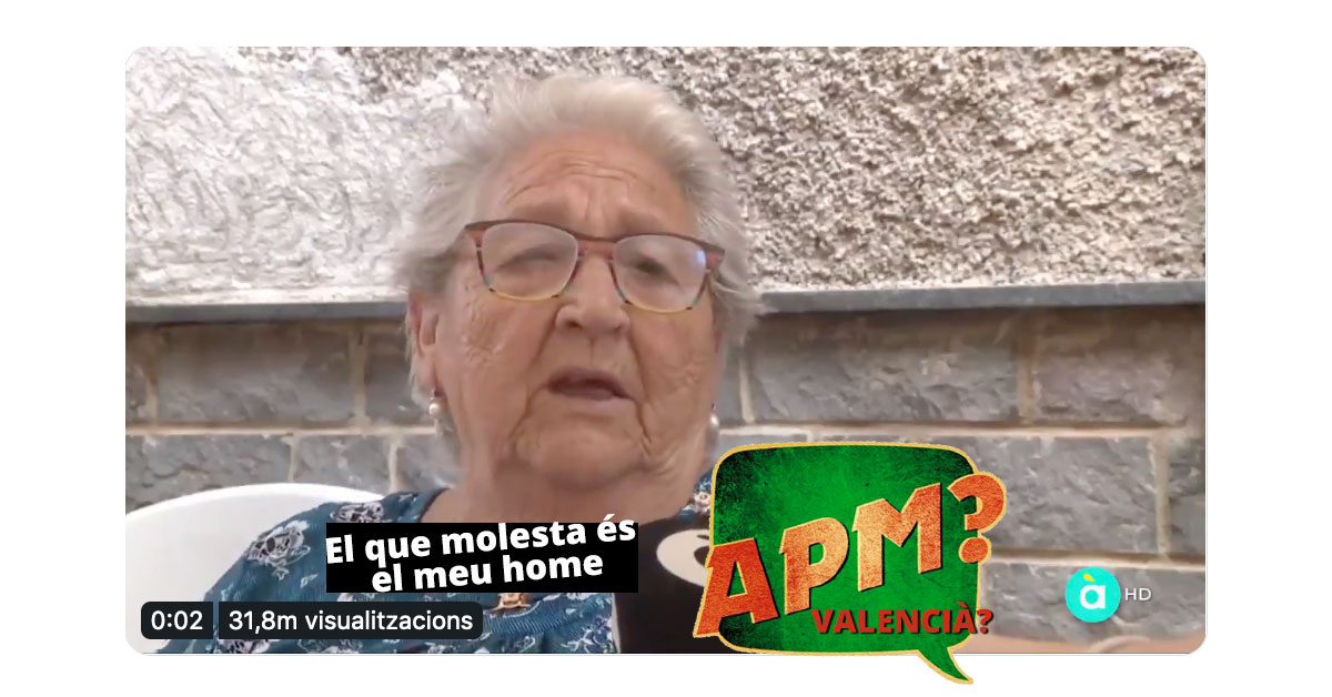 Ja fa temps que reivindiquem un programa de l’estil APM? en versió valenciana. Material no li’n faltaria, de fet, no hi ha setmana que Carolina Ferre, Eugeni Alemany, Joan López o Nerea Sanfe apareguen a l’AMP? original, el de TV3. El perfil de Twitter À Punt Apala ja fa una tasca encomiable perquè no ens perdem ni una d’aquestes joies televisives espontànies. L’última, la senyora molesta… amb el seu home.