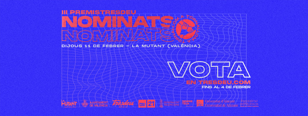 Teniu 3 vots per persona per a cada categoria, escolliu els vostres preferits. El termini es tanca el pròxim dijous 04 de febrer. Moment que els resultats passaran al nostre jurat d’experts/es, els qual decidiran d’entre els 4 finalistes de cada categoria els guanyadors/es finals. I serà el dijous 11 de febrer a La Mutant (València) quan desvelarem els guardonats.