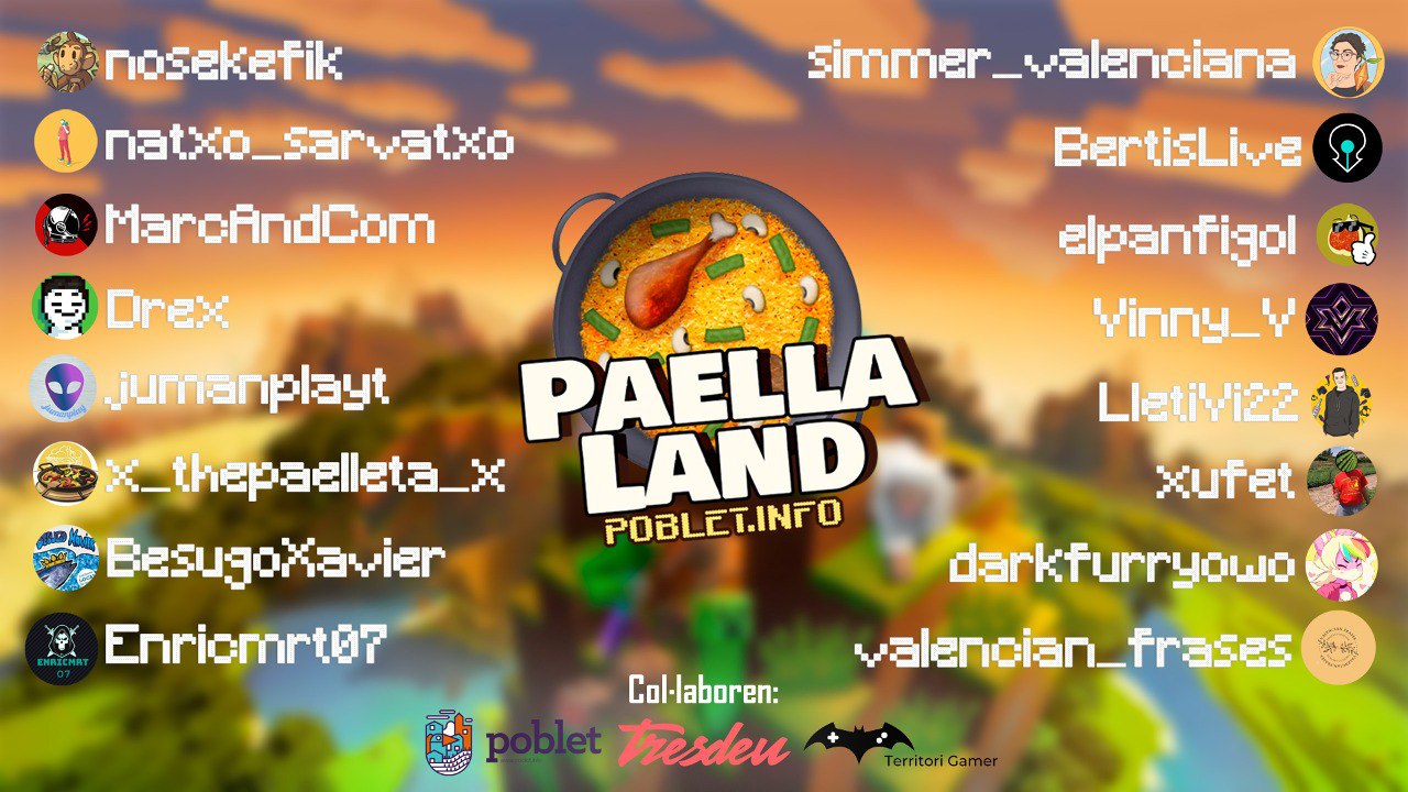 Auronplay ha començat la seua sèrie de Minecraft amb una desena d’streamers (Rubius, Ibai, Luzu, TheGrefg…), anomenada Tortillaland. Els i les creadores valencianes de Twitch -agrupats en Poblet.info– no han volgut ser menys i han creat el seu propi món: Paellaland.