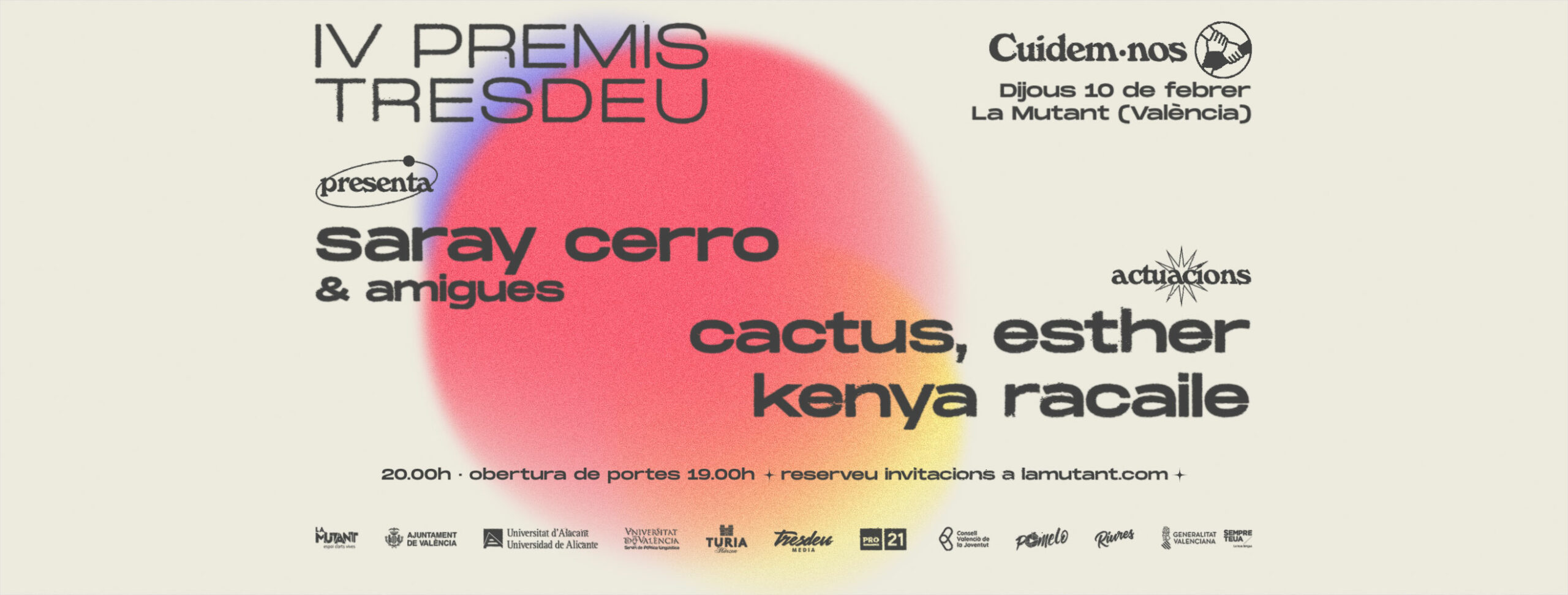 Aquesta nova edició dels Premis Tresdeu a joves creadors/es valencianes ha estat possible gràcies a patrocinadors i col·laboradors necessaris com són l’Ajuntament de València i La Mutant, el Consell Valencià de la Joventut, les Universitats de València i Alacant, Riures, Pomelo TV, Cerveza Túria, Pro21cultural i Bram Studio.