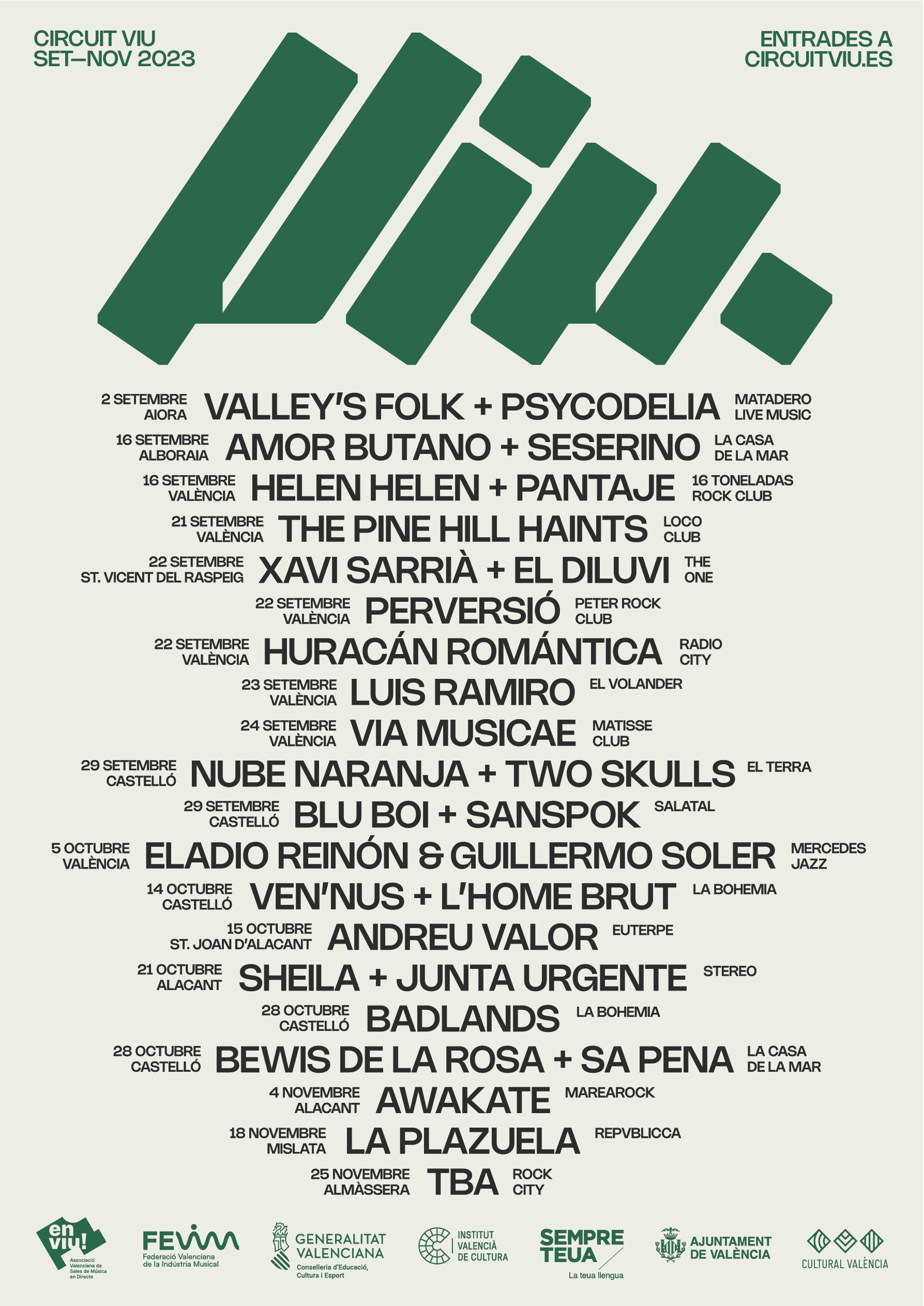 En la seua quarta edició, el Circuit Viu, projecte impulsat per l’Associació Valenciana de Sales de Música en Directe, ha revelat el seu calendari d’esdeveniments. Per a enguany, s’han programat 20 concerts que es duran a terme en 19 diferents sales en tot el territori valencià. Un total de 29 bandes participaran en aquestes presentacions, que tindran lloc entre els mesos de setembre i novembre de 2023.