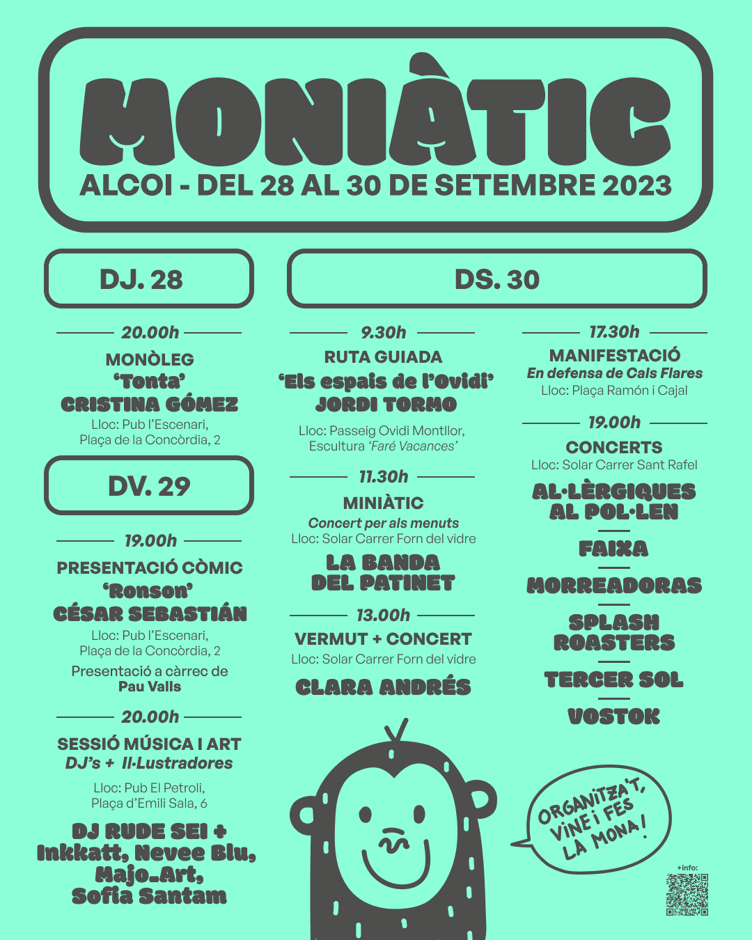 El cap de setmana del 28, 29 i 30 de setembre torna la tretzena edició del Moniàtic, un festival independent que oferirà molta música i tota mena d’activitats gratuïtes per a tots els públics. El barri del Partidor d’Alcoi serà el centre neuràlgic de les activitats durant aquesta última setmana de setembre.