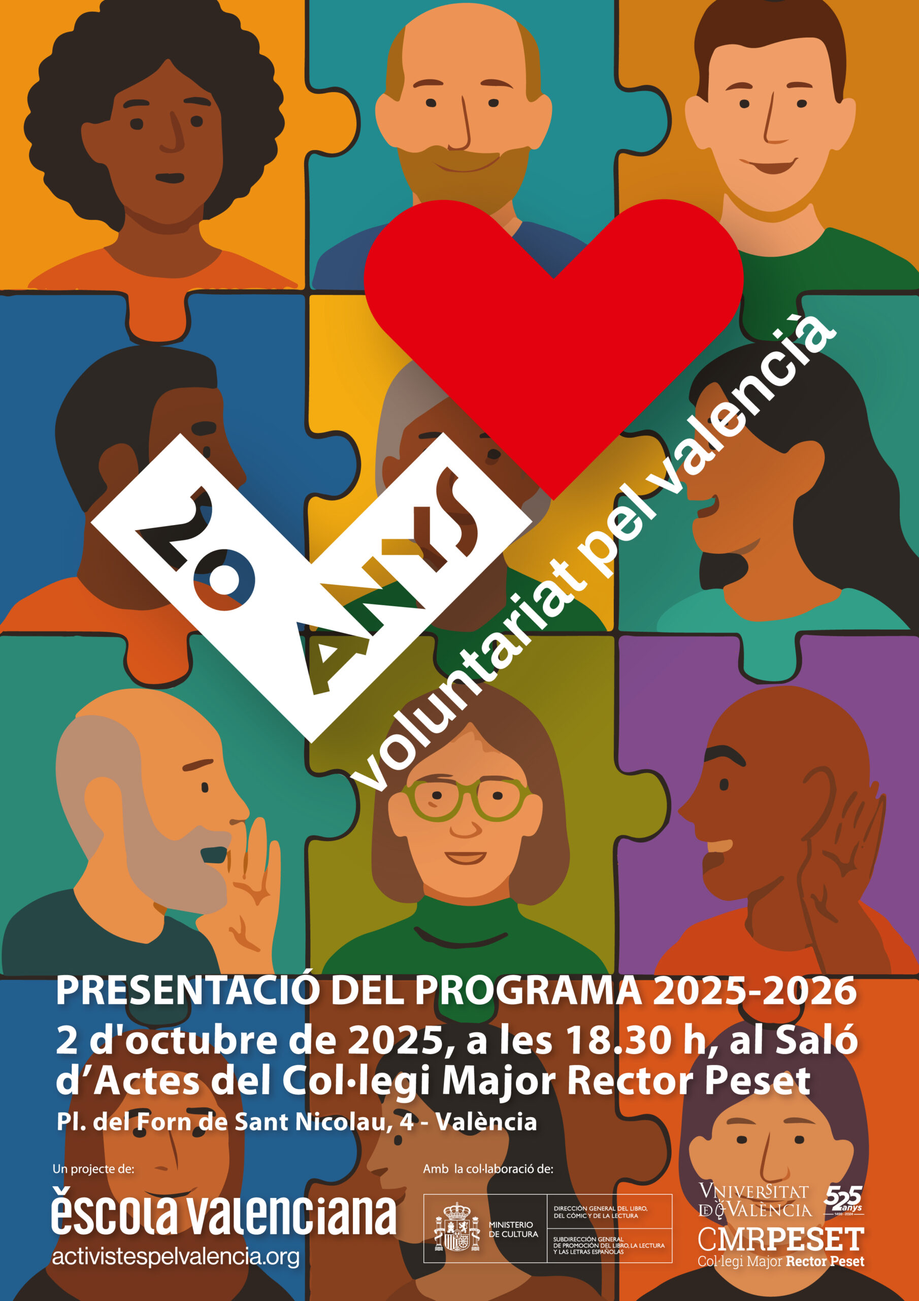 El Voluntariat pel Valencià, impulsat per Escola Valenciana, compleix enguany 20 anys fomentant l’ús social de la llengua a través del voluntariat lingüístic. Per commemorar aquesta efemèride, l’entitat ha presentat la nova edició del programa 2025/26 i el llibre Tasta el món en Valencià, una proposta que recull històries i sabors de la gastronomia internacional. L’acte de presentació se celebrarà dijous 2 d’octubre, a les 18.30 hores, al Saló d’Actes del Col·legi Major Rector Peset de València.