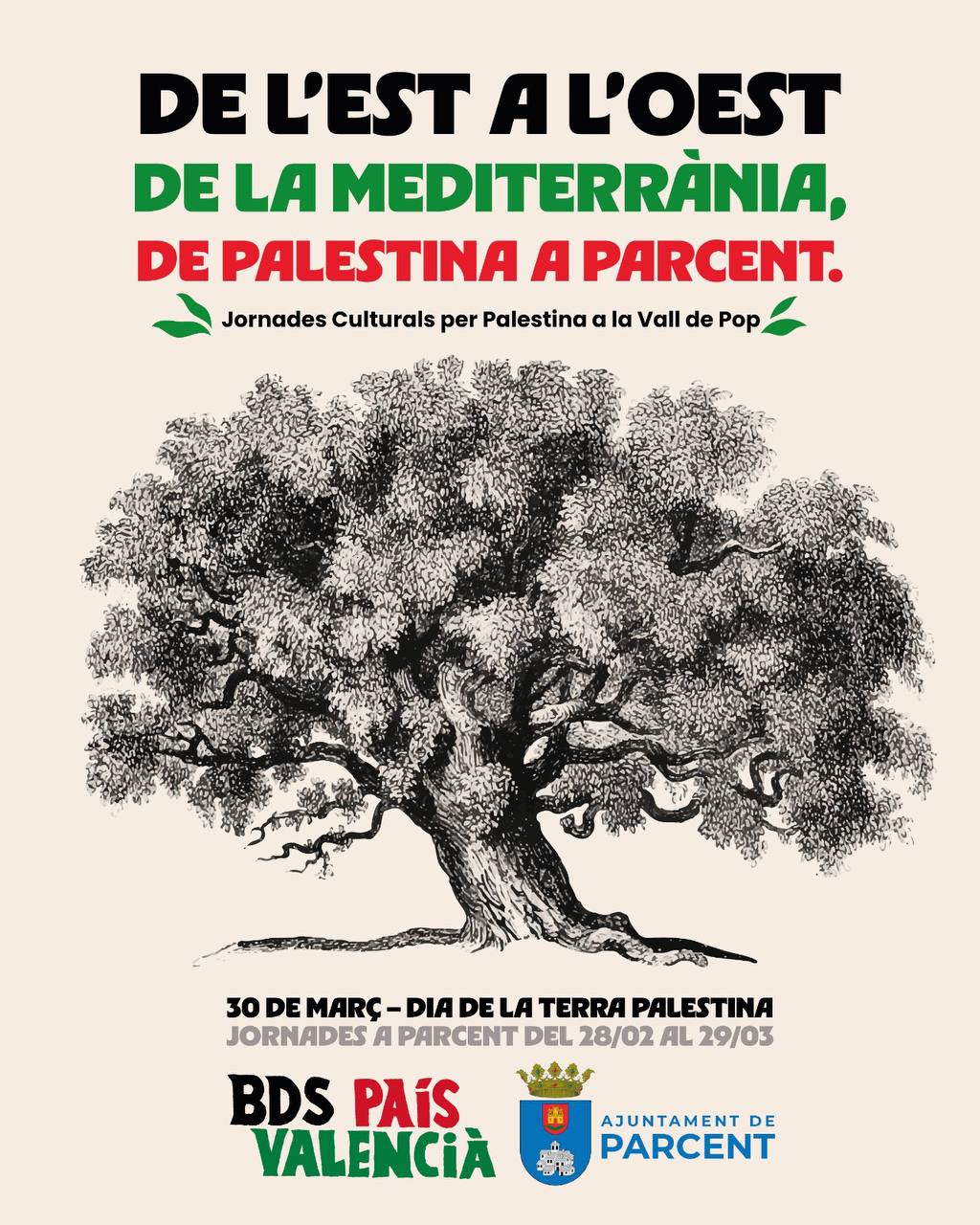 Durant el mes de març, el municipi de Parcent, a la Marina Alta, es convertirà en escenari de les primeres jornades culturals per Palestina de la comarca. Organitzades conjuntament per BDS País Valencià i l’Ajuntament de Parcent, s’articulen entorn del Dia de la Terra Palestina. Seran des del 28 de febrer fins al 29 de març sota el títol De l’est a l’oest de la Mediterrània, de Palestina a Parcent.