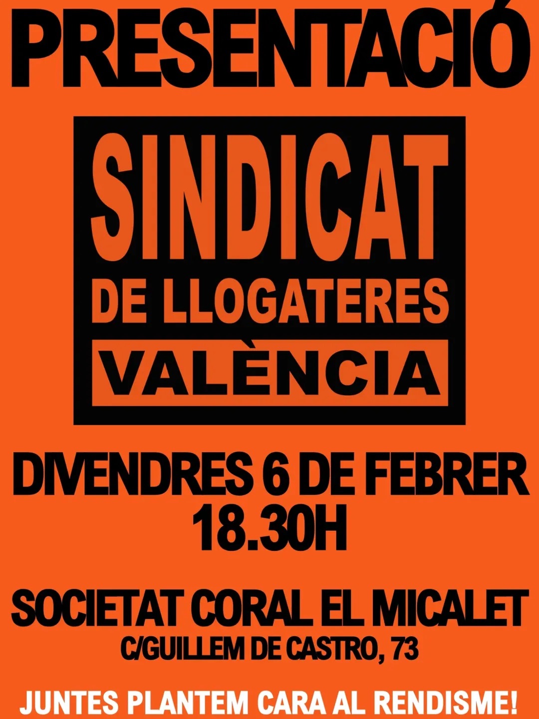 El pròxim divendres 6 de febrer, València assistirà al naixement d’una nova ferramenta de lluita col·lectiva: el Sindicat de Llogateres de València es presentarà públicament a la Societat Coral El Micalet a les 18:30 h. L’organització respon a una realitat: la ciutat lidera les pujades del preu del lloguer a l’Estat espanyol amb increments entre el 15% i el 20% interanual, superant els 1.200 euros en nombrosos barris.